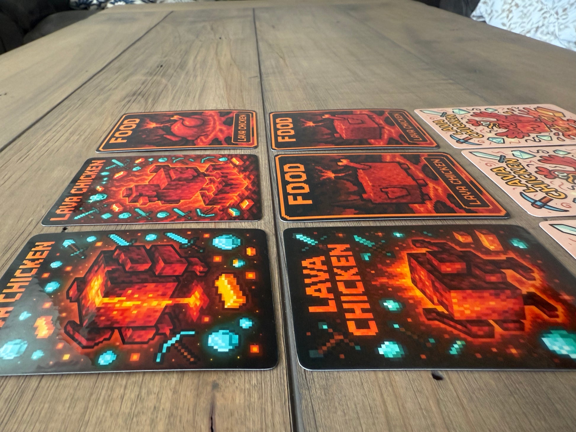 Feed your battlefield with fire! These Lava Chicken Food Tokens are the perfect spicy addition to your Magic: The Gathering game. Featuring two unique styles—bold pixel-art inspired by Minecraft and a vibrant cartoon edition with glittery gems and golden nuggets—these tokens are both fun and functional.